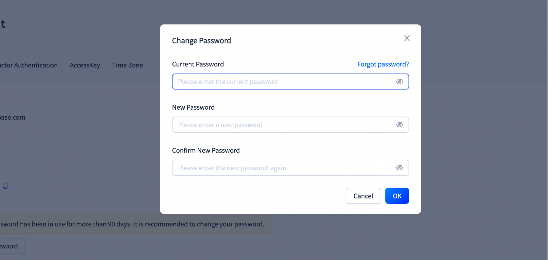 To improve password security, it is recommended to change the login password of your OceanBase Cloud account every 90 days. This topic describes the procedure of modifying your login password.