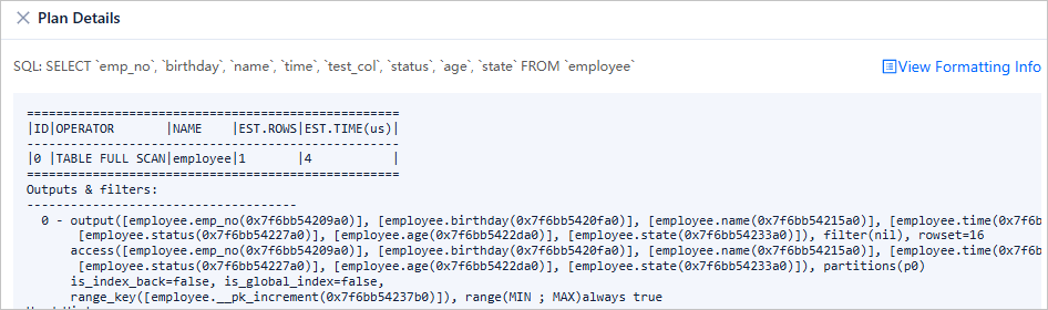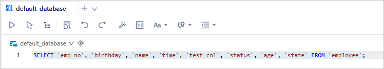 SELECT `emp_no`, `birthday`, `name`, `time`, `test_col`, `status`, `age`, `state` FROM `employee`;Select the SQL statement and click the execution plan icon