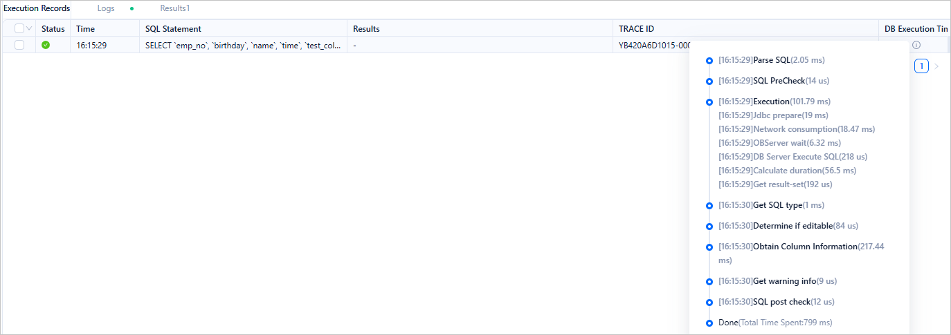 In the Record tab, place the mouse cursor over the prompt icon next to DB Execution Time to view the time-consuming information for SQL execution. This allows you to verify whether the time consumption at each stage matches the actual time consumption.