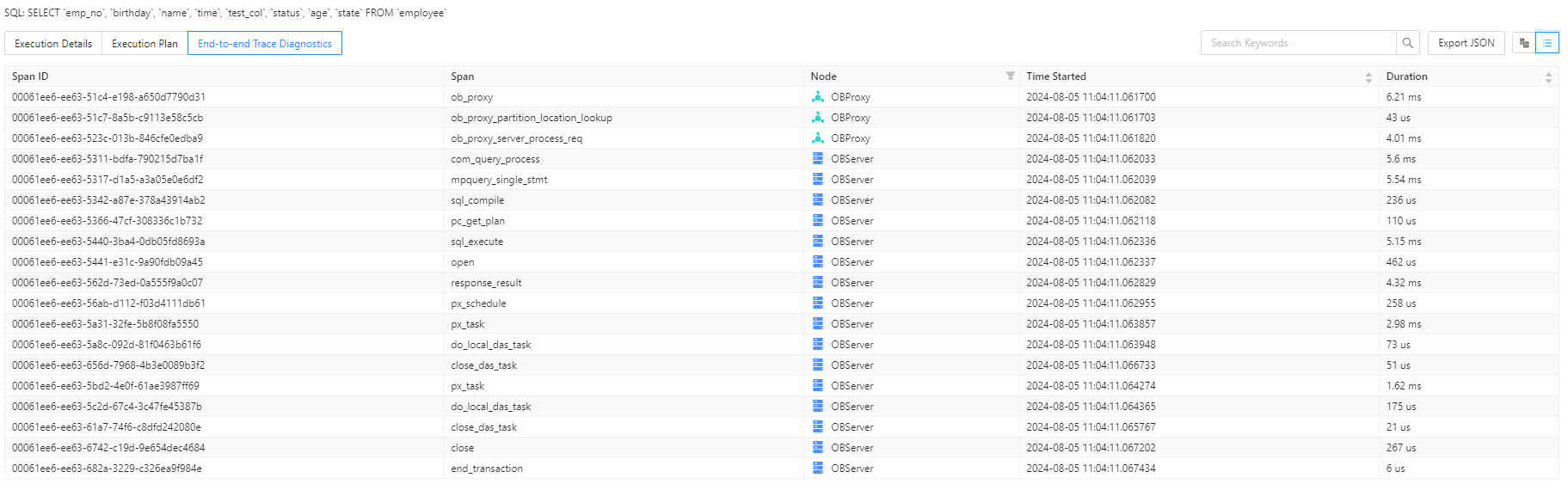 For OceanBase versions above 4.2.0 (with OBProxy version 4.2.0 or later if connected via OBProxy), SQL window supports viewing the information on end-to-end trace diagnostics for SQL. For more details, refer to OceanBase End-to-end Tracing Overview.