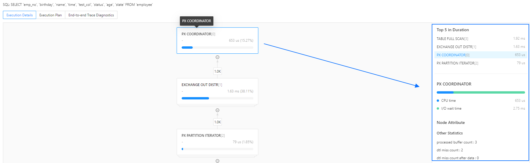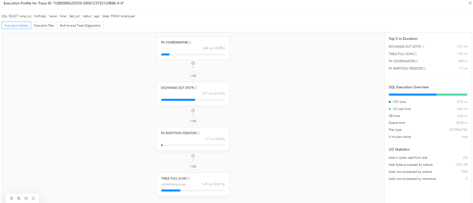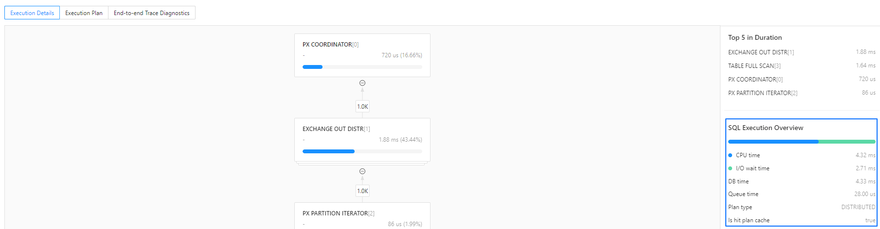 - For OceanBase V4.2.4 and later, but before OceanBase V4.3.0, or OceanBase V4.3.3.1 and later, you can use the Execution Profile to monitor SQL execution in real-time. The Execution Profile helps you quickly view execution details and identify performance bottlenecks.