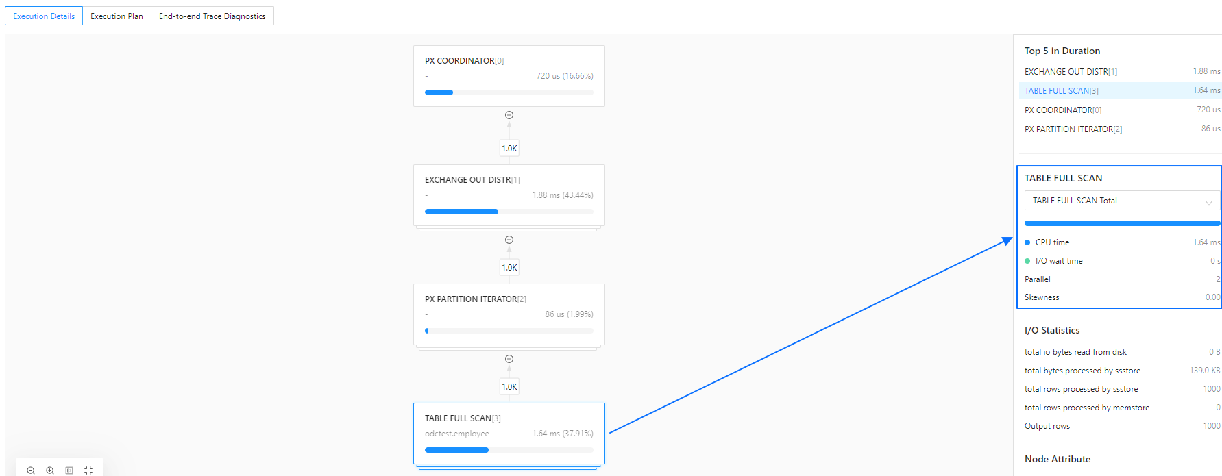 Analyze standalone and distributed execution plans. Parallel operators can be sorted by DB time, I/O memory, and output rows to quickly locate data skew.