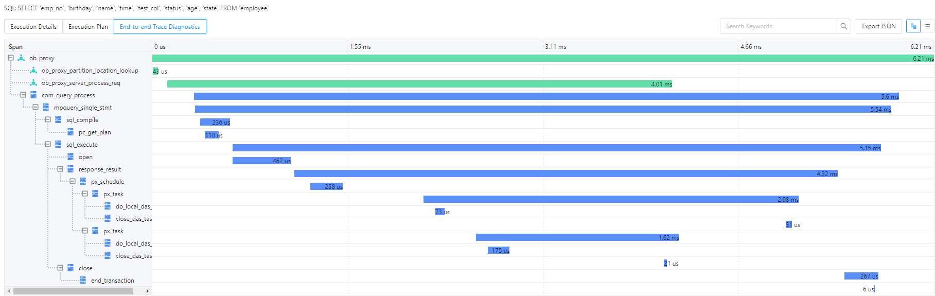 The Trace View shows the overall SQL execution timeline, with support for node expansion and collapse, as well as search highlighting. Hovering over the timeline allows you to view the execution node, start and end times, and detailed data.