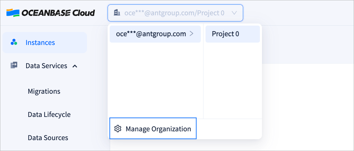 Log in to the OceanBase Cloud console, and click your organization at the top of the page. In the drop-down menu, click Manage Organization.