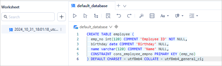 The following example describes how to create a table named employee in the default_database database in the SQL window.
