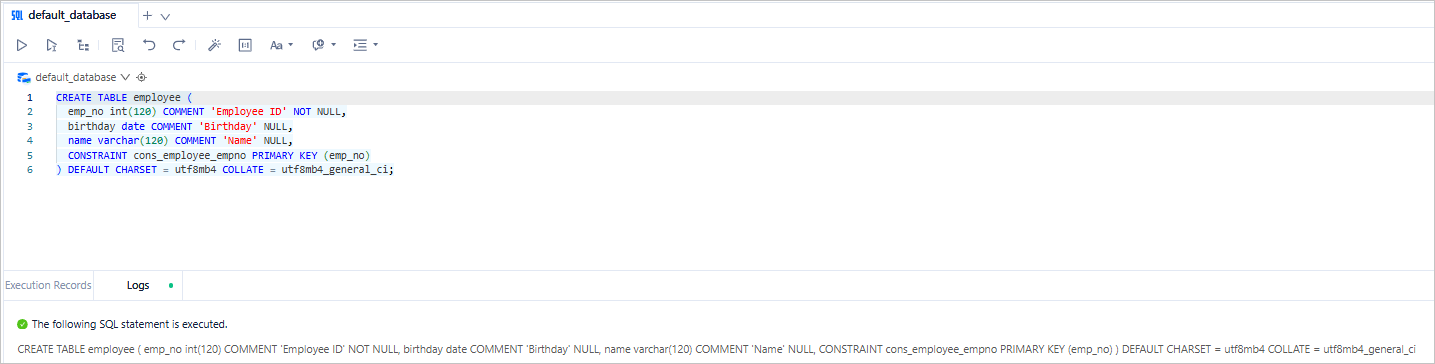 CREATE TABLE employee (emp_no int(120) COMMENT 'Employee ID' NOT NULL, birthday date COMMENT 'Birthday' NULL,name varchar(120) COMMENT 'Name' NULL,CONSTRAINT cons_employee_empno PRIMARY KEY (emp_no)) DEFAULT CHARSET = utf8mb4 COLLATE = utf8mb4_general_ci;The syntax is as follows: