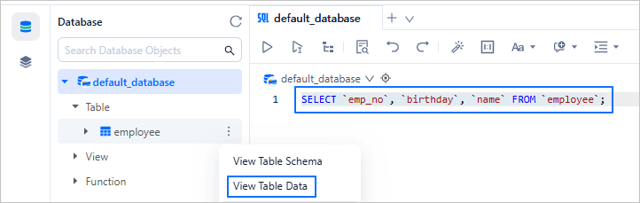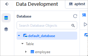 In the left-side navigation pane of the SQL window, check whether the employee table has been created in the default_database database.