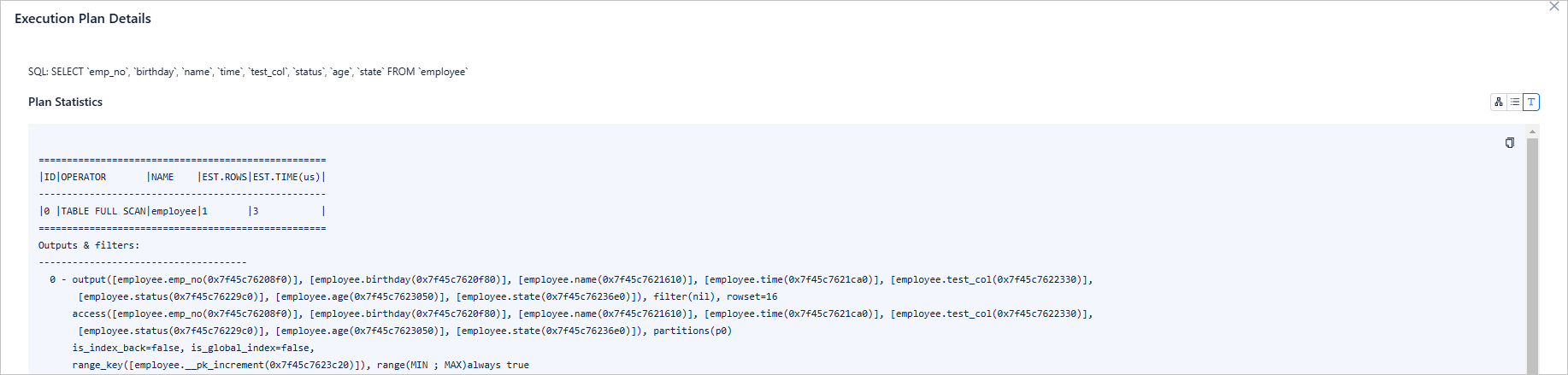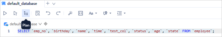 SELECT `emp_no`, `birthday`, `name`, `time`, `test_col`, `status`, `age`, `state` FROM `employee`;As shown in the image above, select the SQL statement and click the execution plan icon