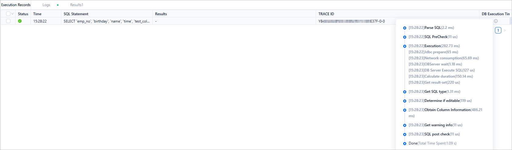 In the Execution Records tab, hover over the tooltip icon next to DB Time to view end-to-end timing information for SQL execution. This helps verify if the time spent in each stage matches the actual execution.