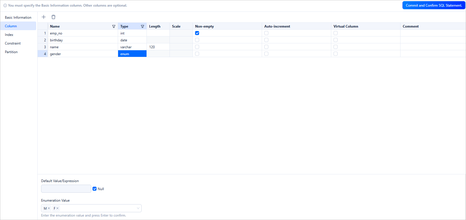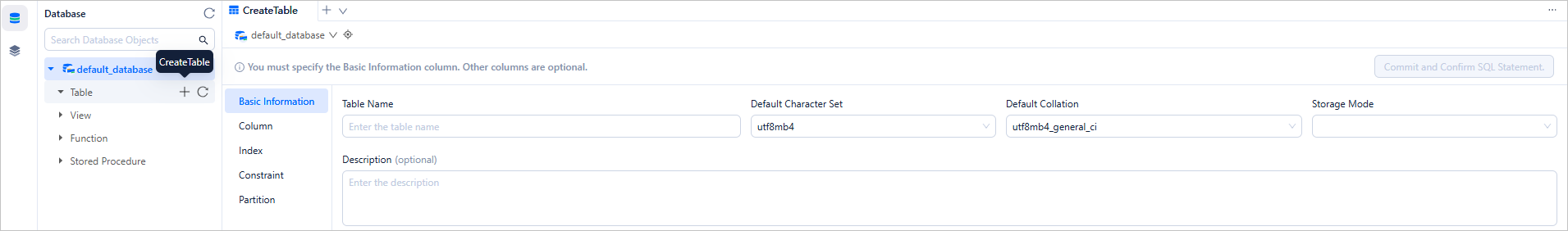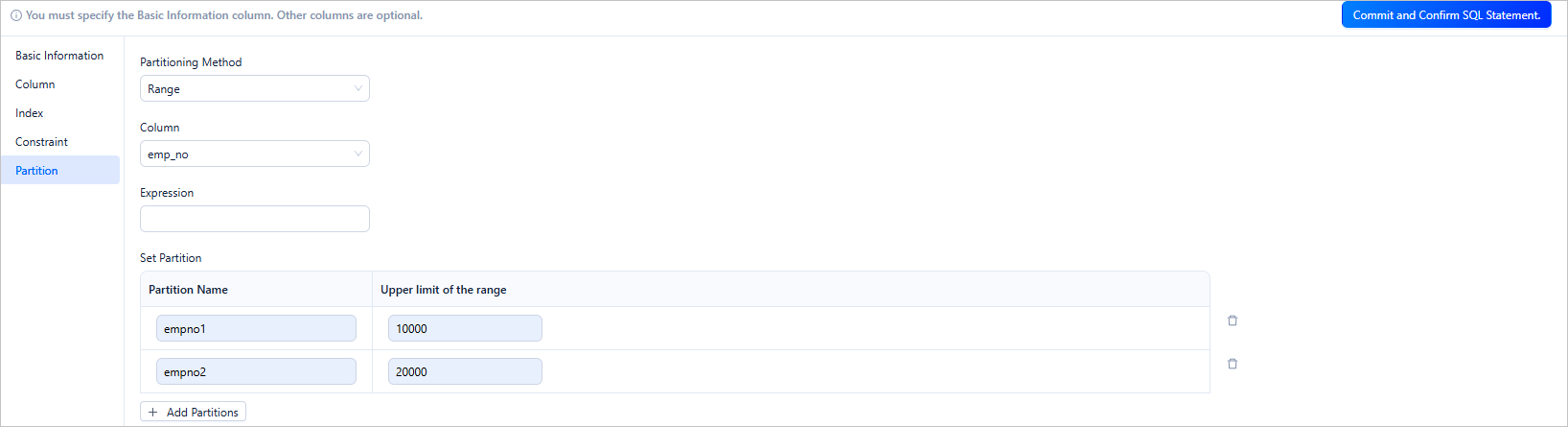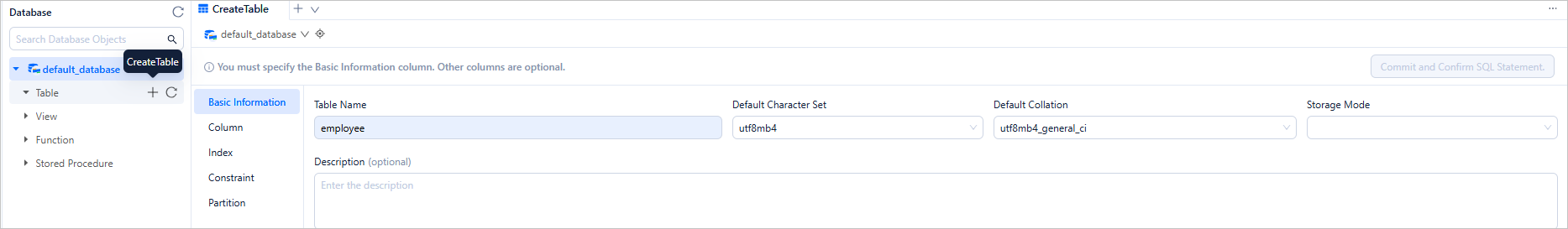 - Settings in the Basic Information and Column sections are required. Settings in other configuration sections are optional. After you specify settings in the Basic Information and Column sections, you can click Commit and Confirm SQL Statement to create a table.