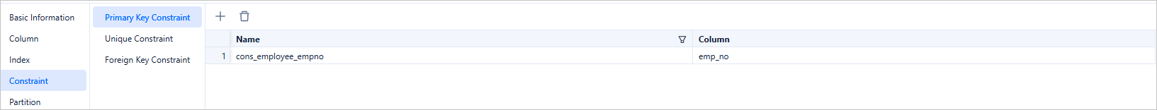Primary Key Constraint: defines a primary key to uniquely identify each row of data in the table. A primary key constraint can be a field or a group of fields. You can set only one primary key constraint for a table, and you cannot edit the constraint after it is configured.