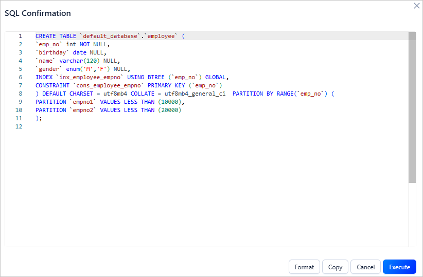 In the following example, a table named employee is created within the database odc_test in the SQL window. The table contains the emp_no, birthday, name, and gender columns.