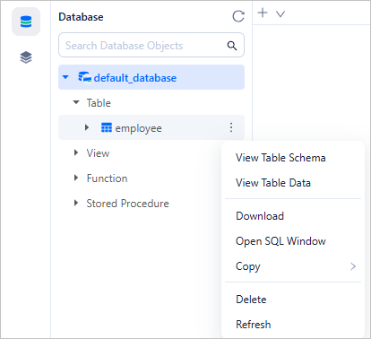 To manage a table, right-click the table name in the list of databases on the left, and select the required operation from the context menu, which provides the following options: View Table Structure, View Table Data, Download, Open SQL Window, Copy, Delete, and Refresh. For more information, see Introduction to common functions.