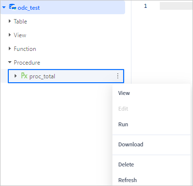 To manage a function, right-click the function name in the left-side navigation pane, and select the required operation from the context menu, which provides the following options: View, Create, Edit, Run, Download, Delete, and Refresh. Edit , Compile , and Debug are not supported in the MySQL compatible mode. For more information, refer to Functional keys in SQL Console.