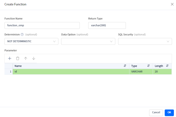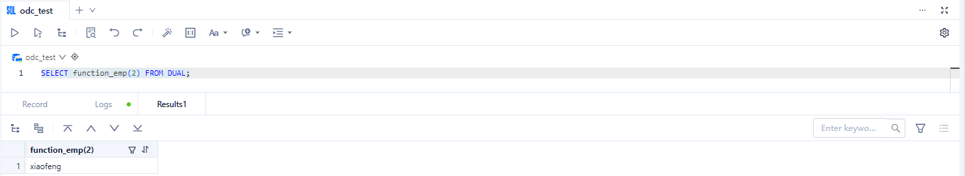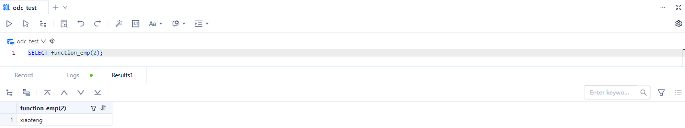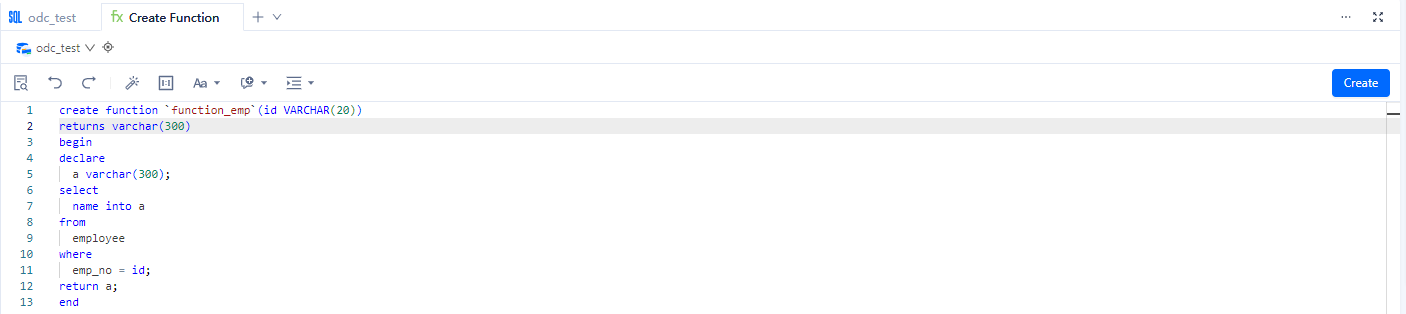 In the following example, a function named function_emp is created in the SQL window to obtain the employee name from an employee table based on the employee ID. The function_emp function contains an INT type id parameter.