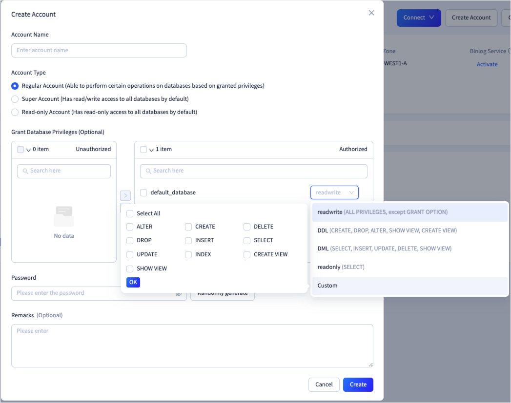 Grant Database Privileges This parameter is displayed only when you create a regular account in a MySQL-compatible tenant. You can grant privileges of the following types to an unauthorized account: Custom, readonly, readwrite, DDL, and DML.