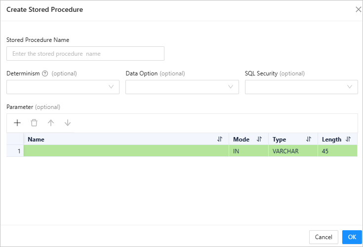 Property Required Default Mode Name Yes Empty Oracle compatible/MySQL compatible Mode Yes IN Oracle compatible/MySQL compatible Type Yes VARCHAR Oracle compatible/MySQL compatible Length Yes 45 MySQL compatible Default value No Empty Oracle compatible