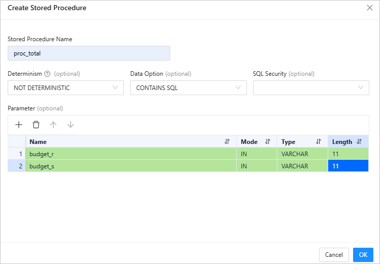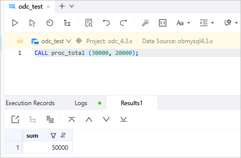 In the following example, a stored procedure named proc_total is created in the ODC console for the calculation of department budgets. The stored procedure contains two INT type input parameters budget_r and budget_s and calculates the sum of the two parameters. Procedure: