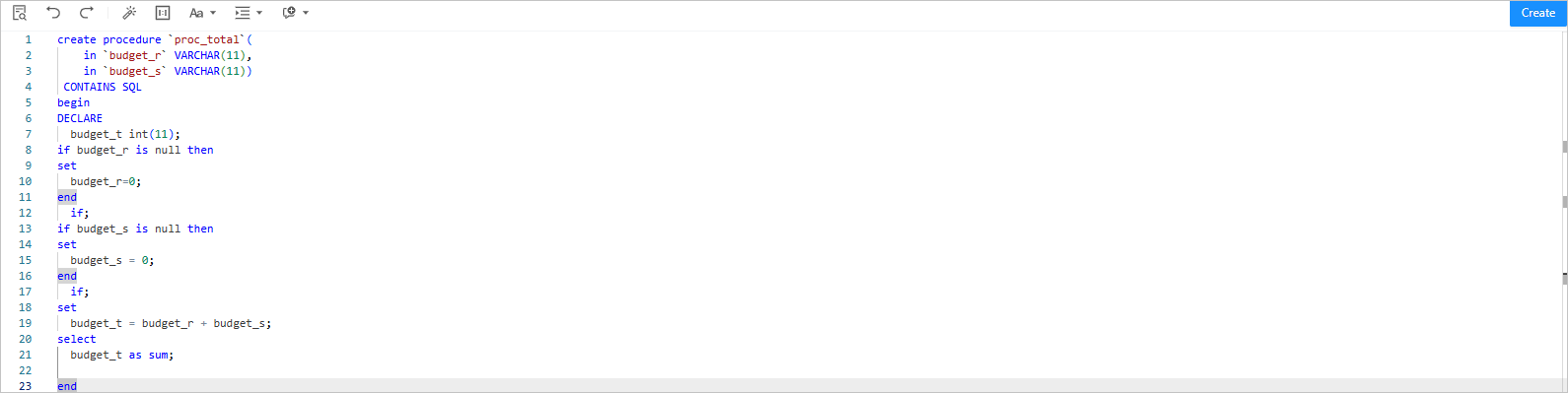 Click Create in the upper-right corner to create the stored procedure. After a stored procedure is created, you can use the CALL statement to call it, just like how you call a built-in function.