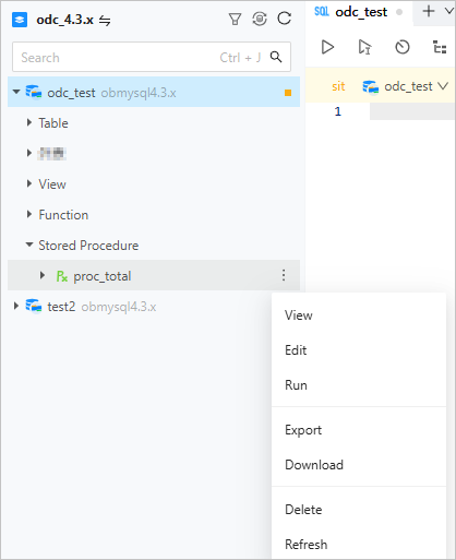 To manage a stored procedure, right-click the stored procedure name in the left-side navigation pane, and select the required operation from the context menu, which provides the following options: View, Create, Edit, Run, Download, Delete, and Refresh.For more information, see Manage stored procedures.