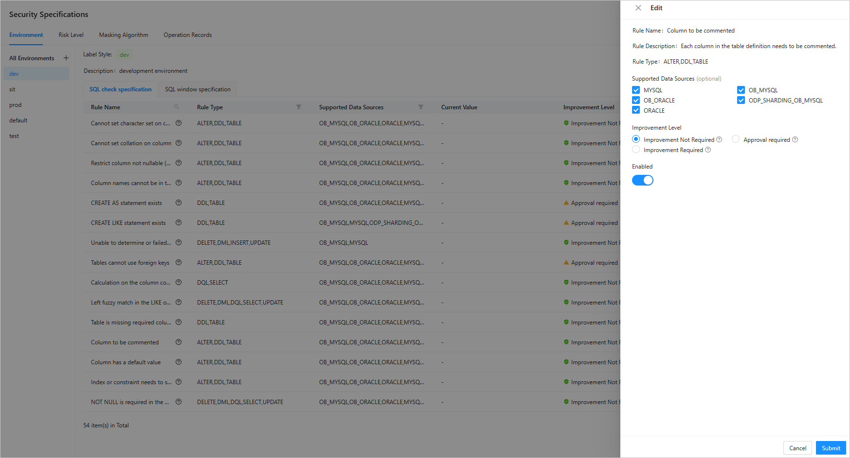 After the OceanBase Cloud console, enter the Web ODC. In the project collaboration window, choose Security Specifications > Environment > sit > SQL check specification.