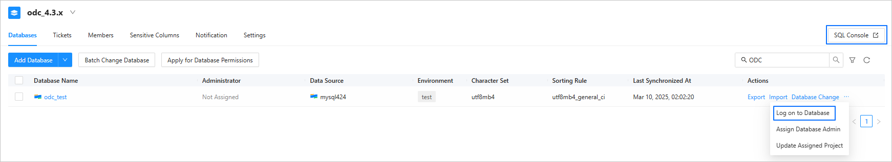 Click database name/SQL console/log in to database to log in to the database and go to the SQL development window.