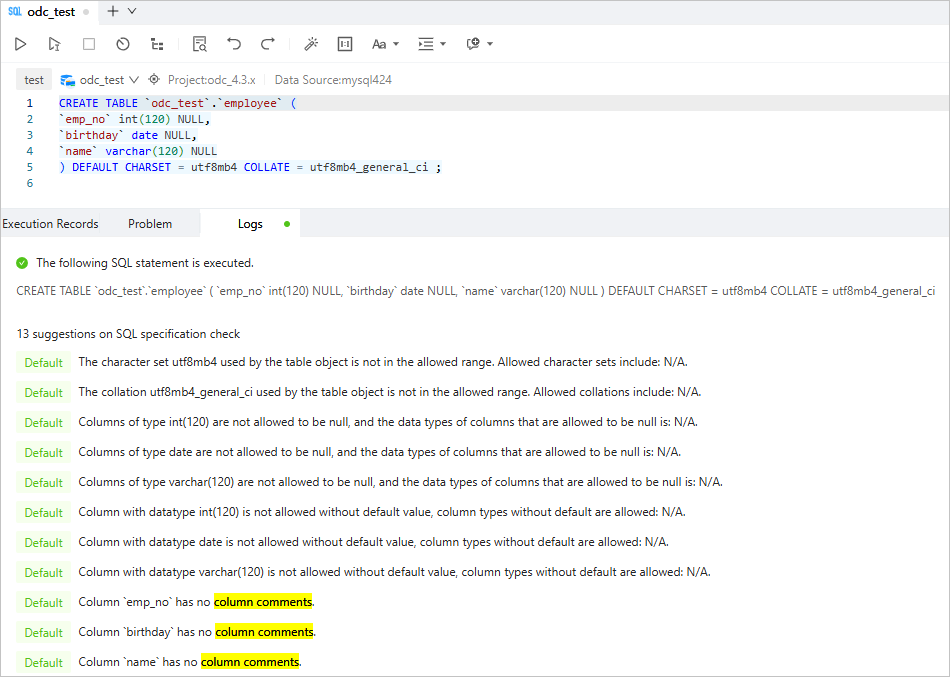 CREATE TABLE `odc_test`.`employee` ( `emp_no` int(120) NULL, `birthday` date NULL, `name` varchar(120) NULL ) DEFAULT CHARSET = utf8mb4 COLLATE = utf8mb4_general_ci ;As shown in the preceding figure, the No column comment message is printed in the log.