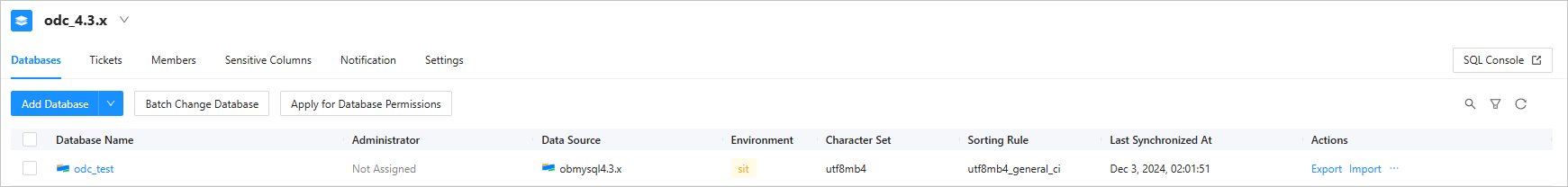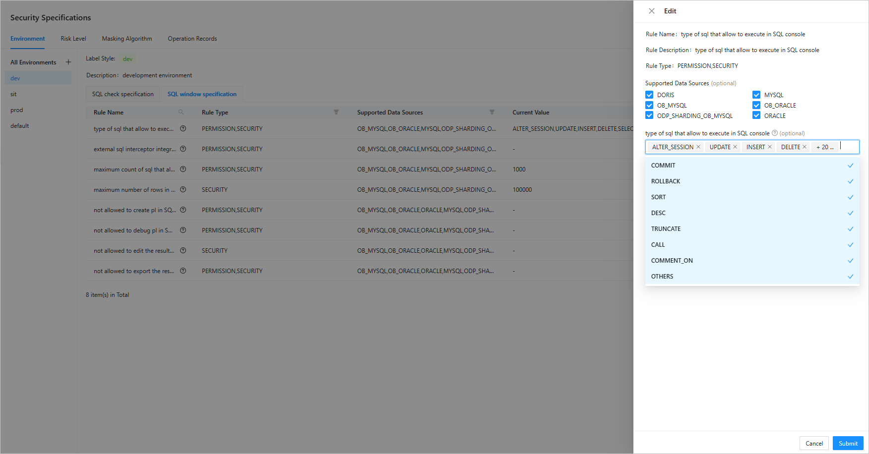 After the OceanBase Cloud console, enter the Web ODC. In the project collaboration window, choose Security Specifications > Environment > sit > SQL window specification.