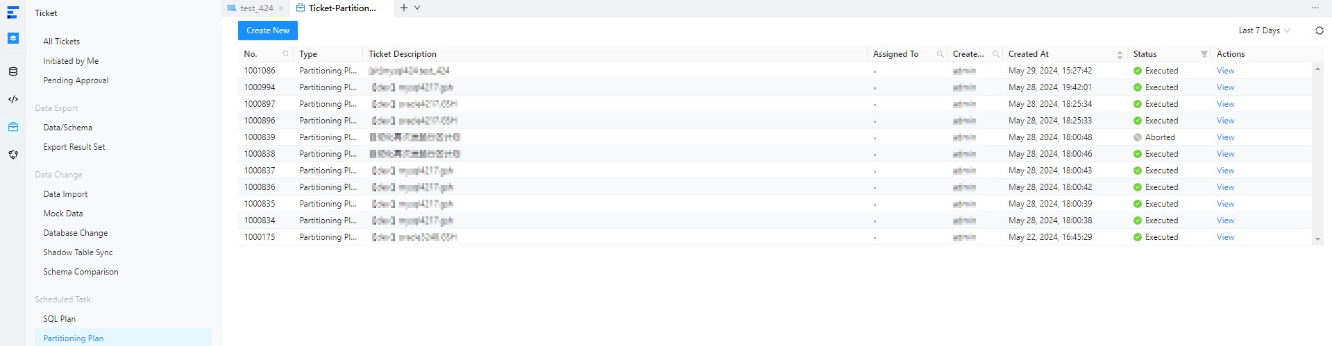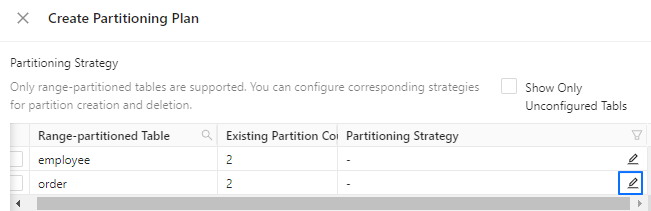 CREATE TABLE `order` ( `time` date NOT NULL, `parti_key` int(11), `name` varchar(120) DEFAULT NULL ) partition by range columns(time, parti_key) (partition p2023_01 values less than ('2023-01-01', 20230101), partition p2023_02 values less than ('2023-02-01', 20230201))On the Tickets tab of the SQL window, choose Partitioning Plan > Create New.