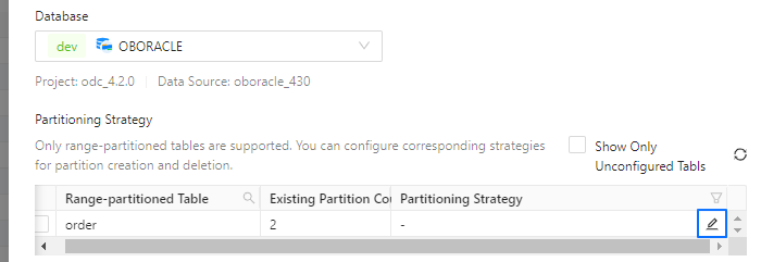 The example in this section describes how to set a partition creation strategy and a partition deletion strategy for the order table in the odc_test database of the obmysql4.3.0 data source.