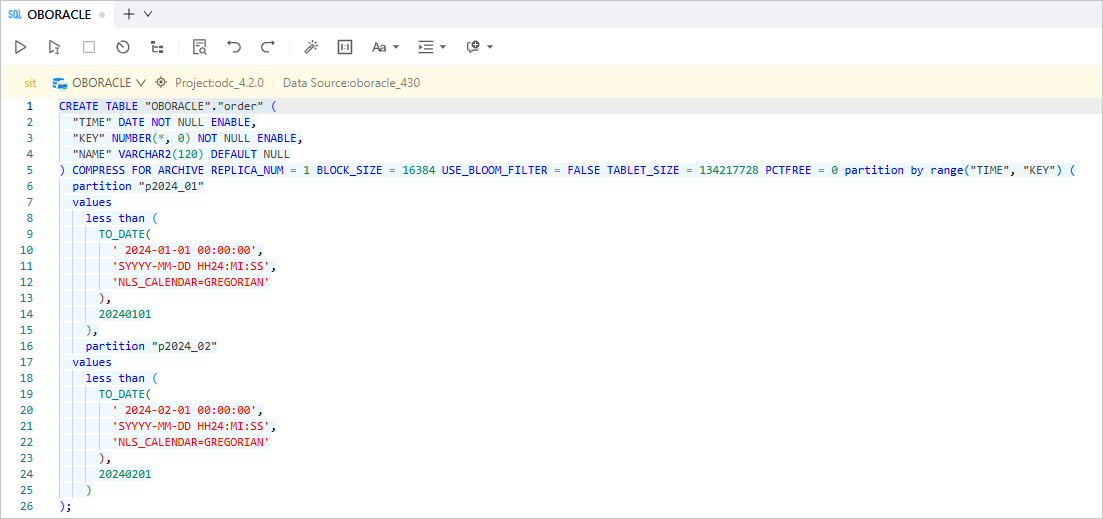 CREATE TABLE "OBORACLE"." order" ( "TIME" DATE NOT NULL ENABLE, "KEY" NUMBER(*,0) NOT NULL ENABLE, "NAME" VARCHAR2(120) DEFAULT NULL ) COMPRESS FOR ARCHIVE REPLICA_NUM = 1 BLOCK_SIZE = 16384 USE_BLOOM_FILTER = FALSE TABLET_SIZE = 134217728 PCTFREE = 0 partition by range("TIME", "KEY") (partition "p2024_01" values less than (TO_DATE(' 2024-01-01 00:00:00', 'SYYYY-MM-DD HH24:MI:SS', 'NLS_CALENDAR=GREGORIAN'),20240101), partition "p2024_02" values less than (TO_DATE(' 2024-02-01 00:00:00', 'SYYYY-MM-DD HH24:MI:SS', 'NLS_CALENDAR=GREGORIAN'),20240201));On the Tickets tab of the SQL window, choose Partitioning Plan > Create New.