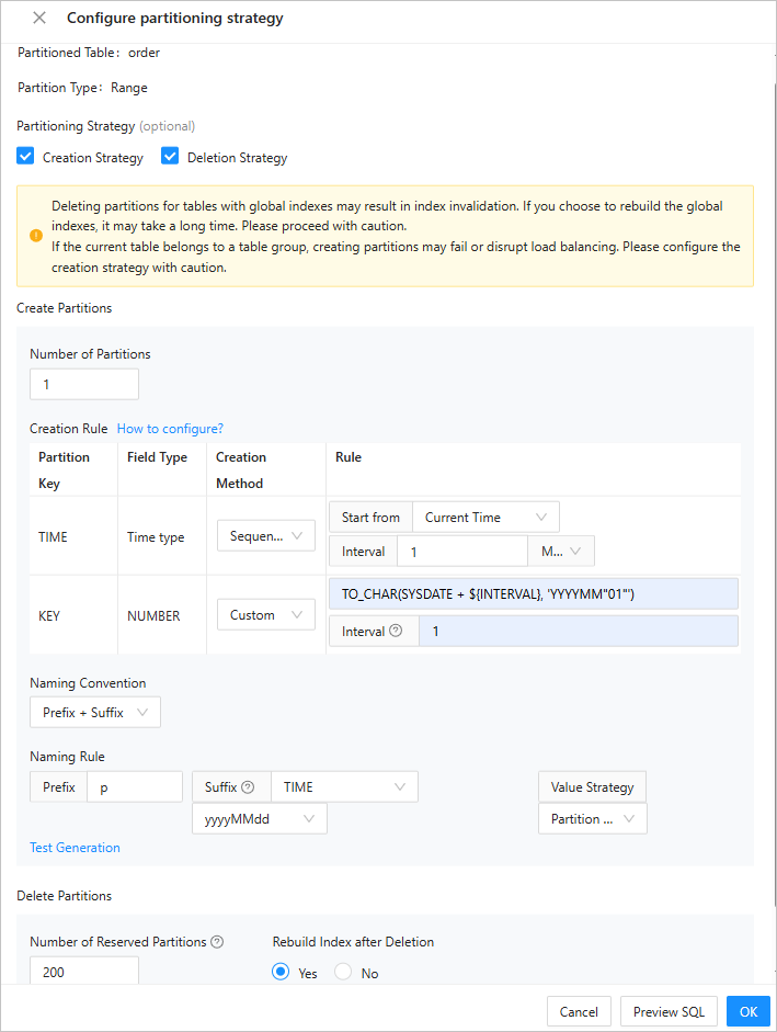 TIMEandKEYpartitioning keys in theordertable.TIME: The data type of this partitioning key isDATE, which is a time type. Therefore, you can select Sequentially Increase as the creation method. In the example, according to the partition creation strategy for theTIMEpartitioning key, the current time (the time when the partitioning plan task is run) is used as the reference time and partitions are created at a time interval of 1 month.KEY: The data type of this partitioning key isNUMBER, which is not a time type. Therefore, you can select only Custom as the creation method. Assume that you need to use the current system time as the reference time and create partitions at a time interval of 1 month. According to the description in the Custom partition creation strategy section of the Set partitioning strategies topic, you can perform the following steps to generate the partitioning expression:Obtain the reference time for partition creation: The current time is used as the reference time. Therefore, you can directly use the