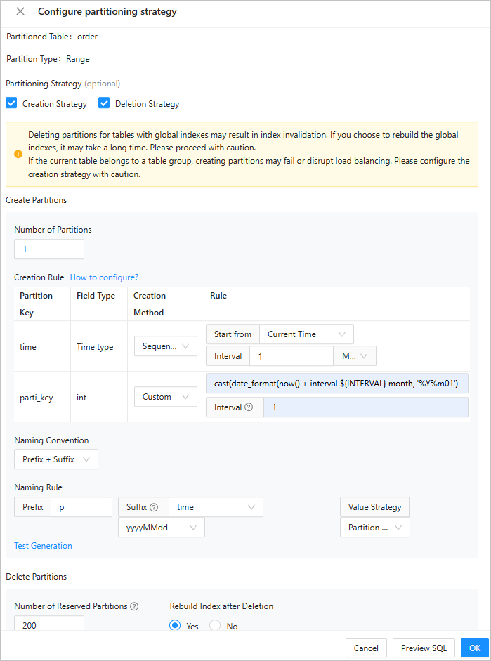 now()function.Set the time interval for generating partitions: In the example, the time interval is 1 month. Therefore, you must enter