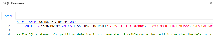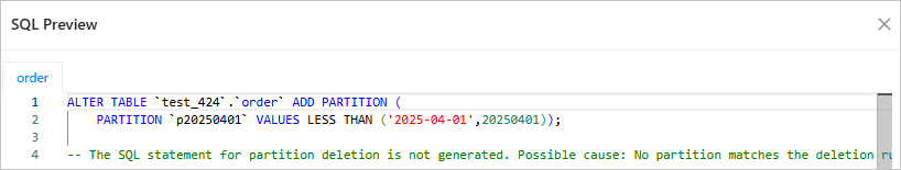 Click Preview SQL in the lower-right corner of the Configure partitioning strategy panel to view the SQL statement generated by the configured partitioning strategies.