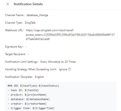 In the notification channel list, click View in the Actions column of a notification channel to view its detailed configurations.