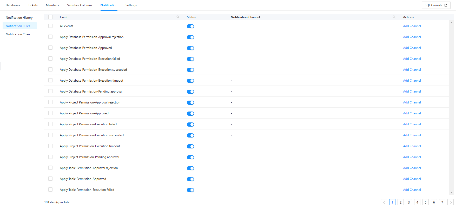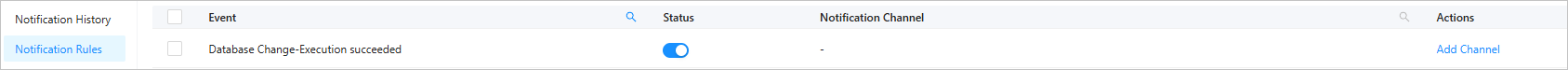 Log in to the OceanBase Developer Center (ODC) console. Choose Projects > Notification. On the Notification tab, click Notification Rules in the left-side navigation pane. Then, you can view the supported ticket events and the enabling status and notification channels of the ticket events.