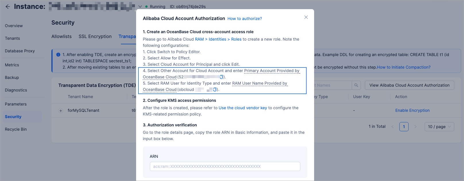 You can find the OceanBase Cloud account ID and RAM username under Security > Transparent Data Encryption (TDE) > View Alibaba Cloud Account Authorization.