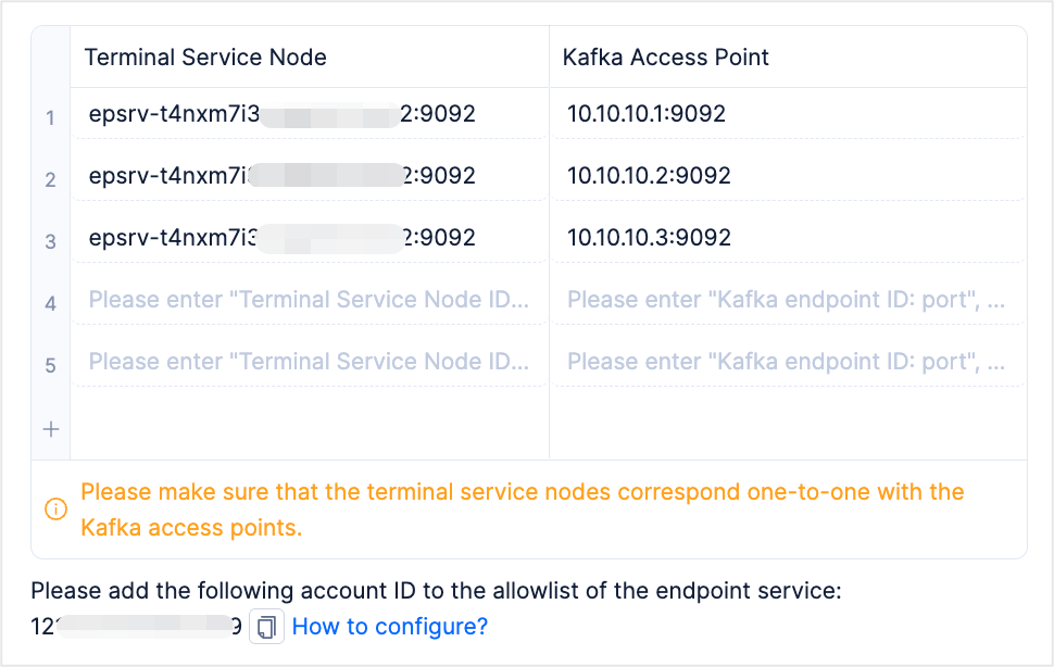 Region The region where the data source is located. Instance Type The type of the Kafka instance. Valid values: Self-managed Kafka and Cloud Instance Kafka. Connection Information The name of the endpoint service and the Kafka endpoint of the selected cloud vendor.