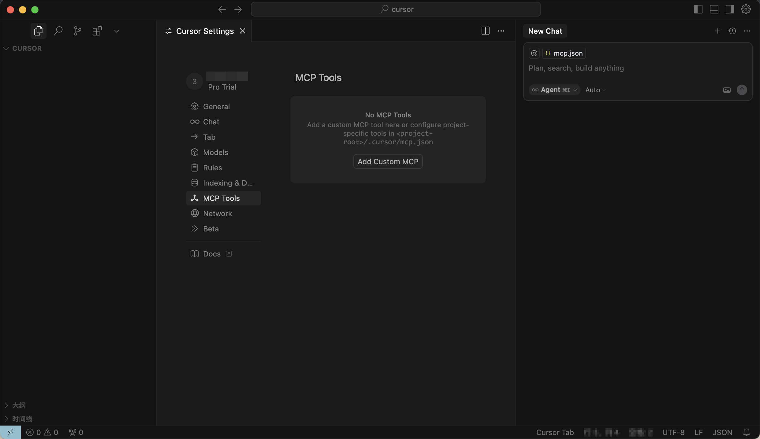 Press the shortcut key Ctrl + L (Windows) or Command + L (MacOS) to open the chat window and click the gear icon in the upper right corner, then select MCP Tools.