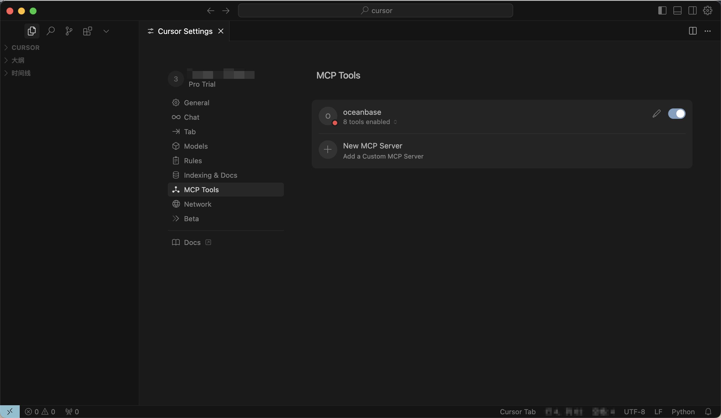 /path/to/your/mcp-oceanbase/src/oceanbase_mcp_serverneeds to be replaced with the absolute path of the mcp-oceanbase folder, andOB_HOST,OB_PORT,OB_USER,OB_PASSWORD, andOB_DATABASEneed to be replaced with your database's corresponding information:{ "mcpServers": { "oceanbase": { "command": "uv", "args": [ "--directory", "/path/to/your/mcp-oceanbase/src/oceanbase_mcp_server", "run", "oceanbase_mcp_server" ], "env": { "OB_HOST": "***", "OB_PORT": "***", "OB_USER": "***", "OB_PASSWORD": "***", "OB_DATABASE": "***" } } } }If the configuration is successful, the status will change to