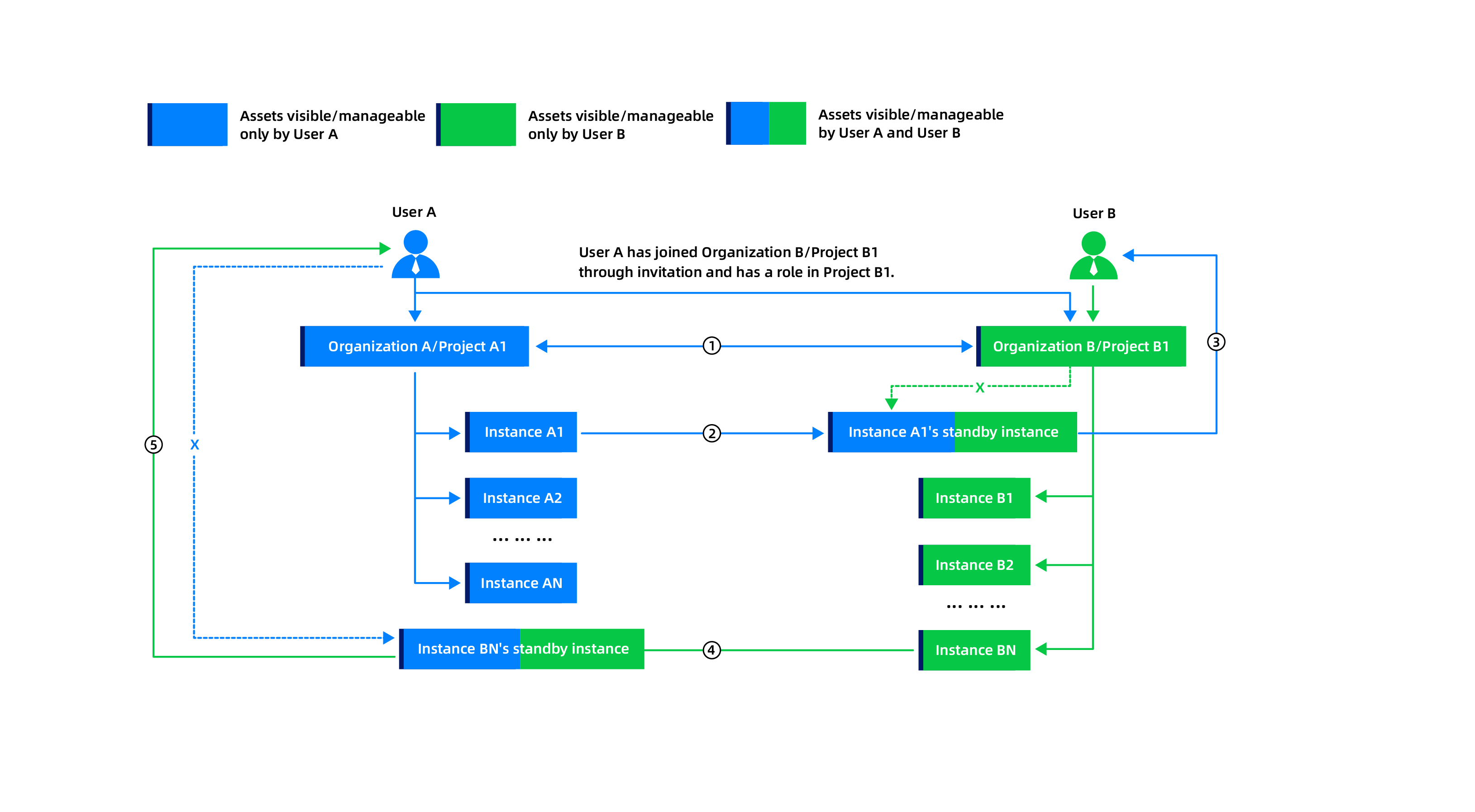 | 2 | User A creates a standby instance of Instance A1 (of Project A1 of Organization A) in Project B1 of Organization B. Now, User A has operation permissions on the standby instance, while User B can only view the standby instance. |