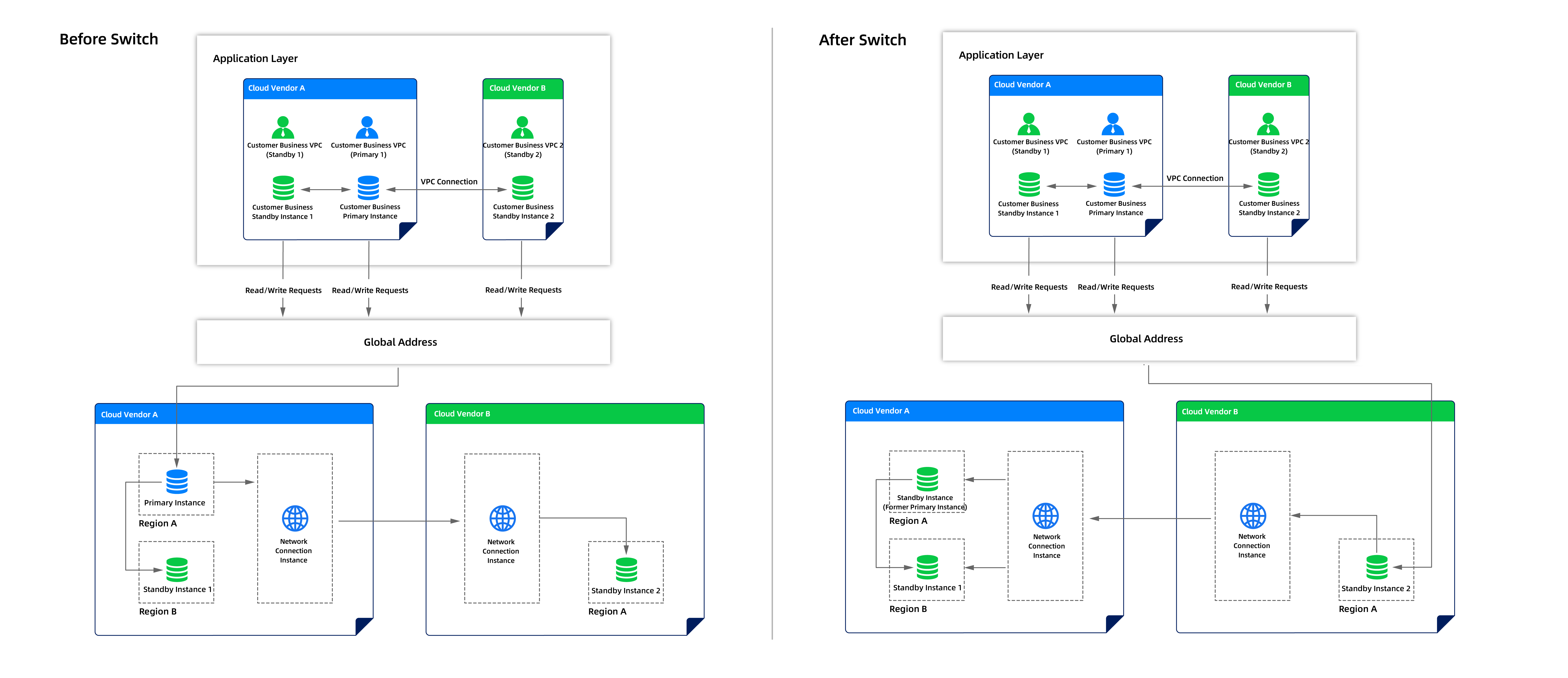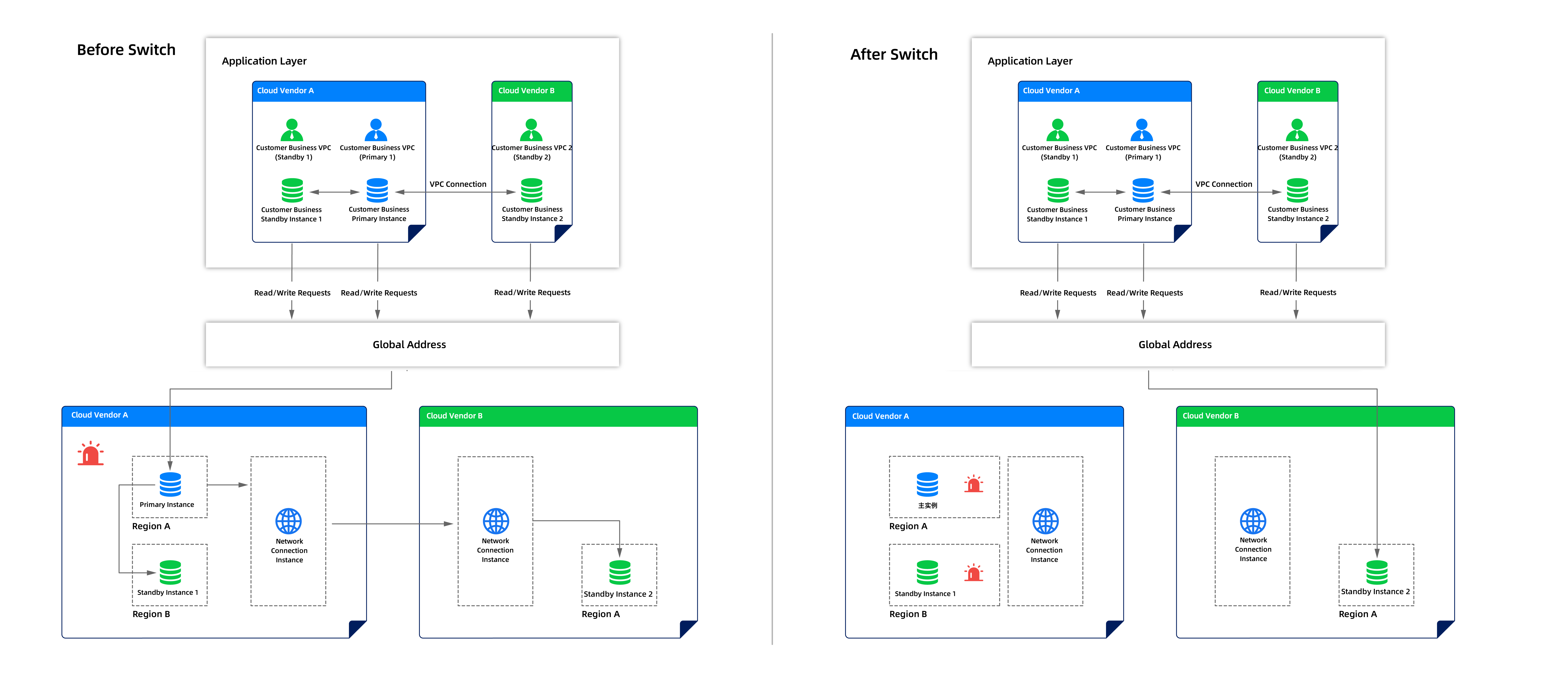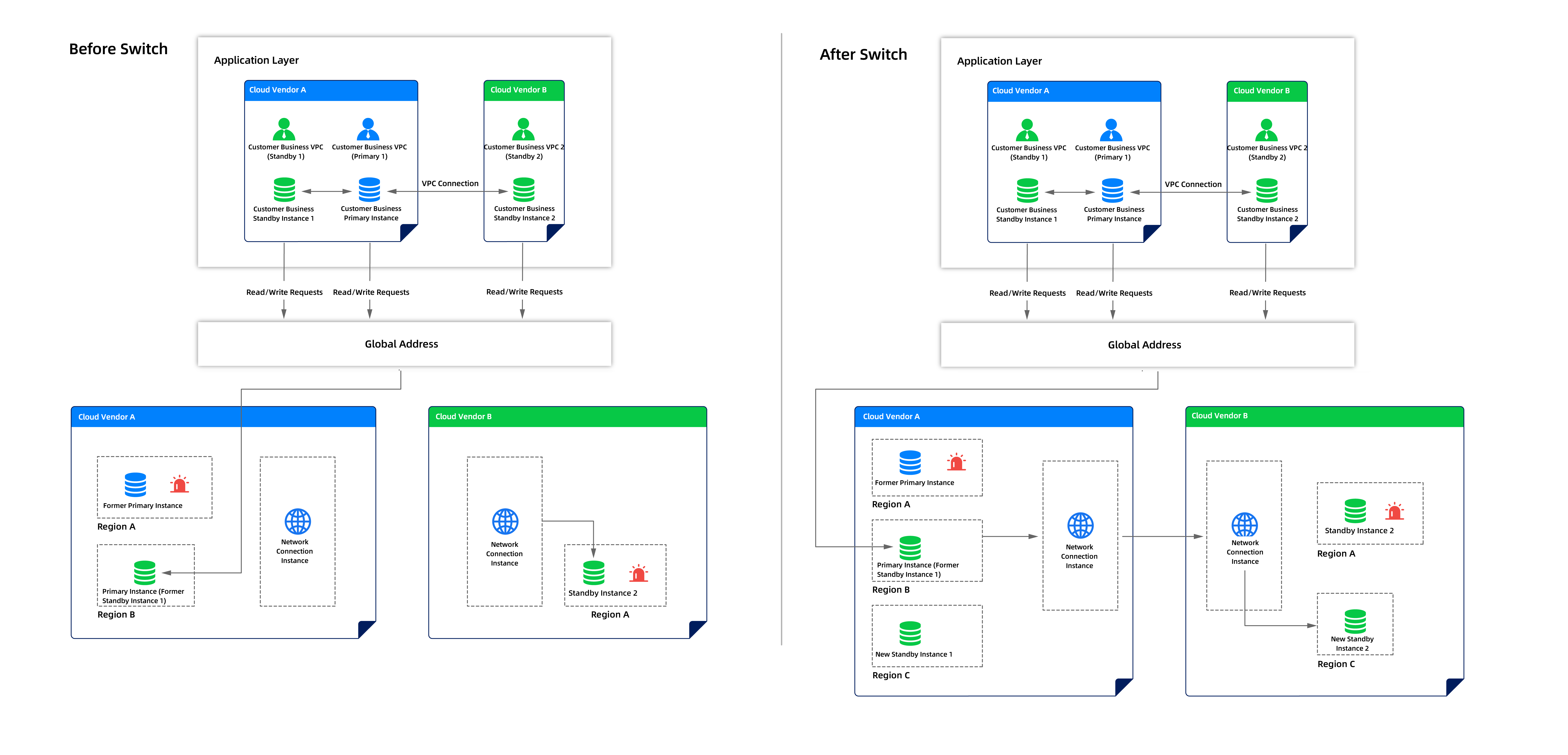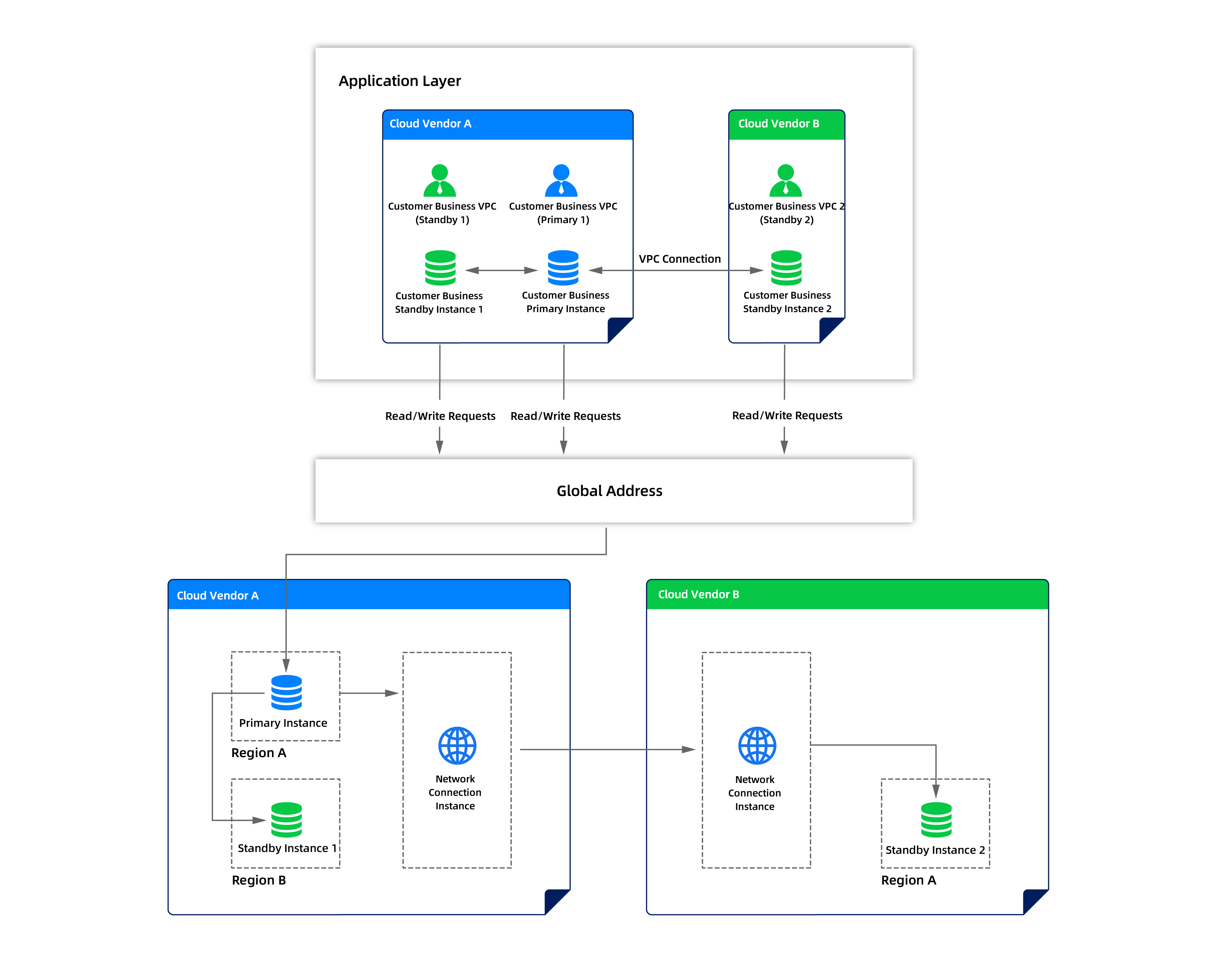 For example, if the primary database is deployed on cloud vendor A and the standby database on cloud vendor B, a failure in cloud vendor A can immediately redirect business traffic to the standby database on cloud vendor B, ensuring business continuity.