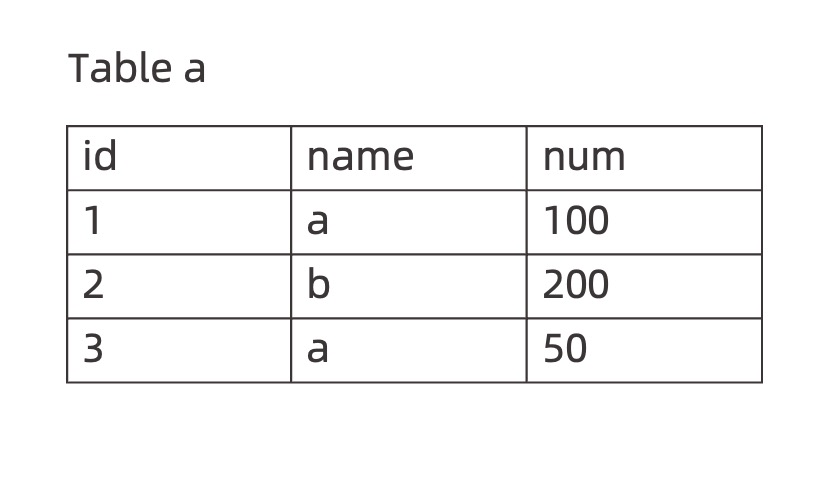 idandnamevalues from tablea, calculate the sum of thenumvalues byname, and return the calculation results.obclient> SELECT id, name, SUM(num) FROM a GROUP BY name; +------+------+----------+ | id | name | SUM(num) | +------+------+----------+ | 1 | a | 150 | | 2 | b | 200 | +------+------+----------+Query the