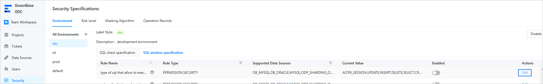 SQL window specification tab, edit the rule namedSQL types allowed to be executed in SQL window .On the edit SQL check specification page, enable SQL types allowed to be executed in SQL window, click