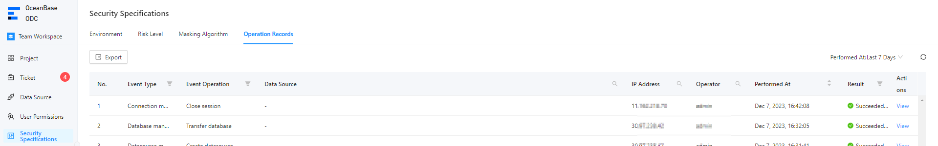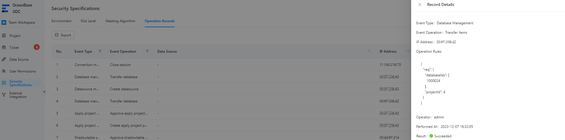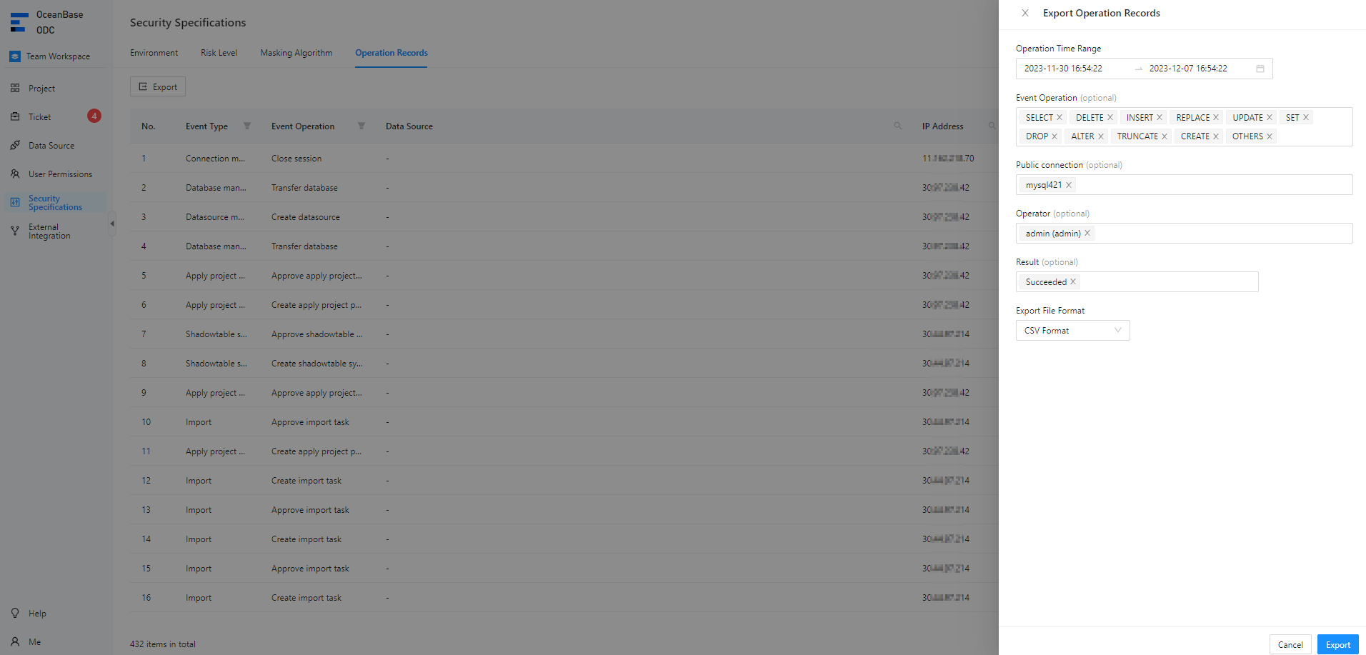 You can view and export historical operation records in the OceanBase Developer Center (ODC) console.