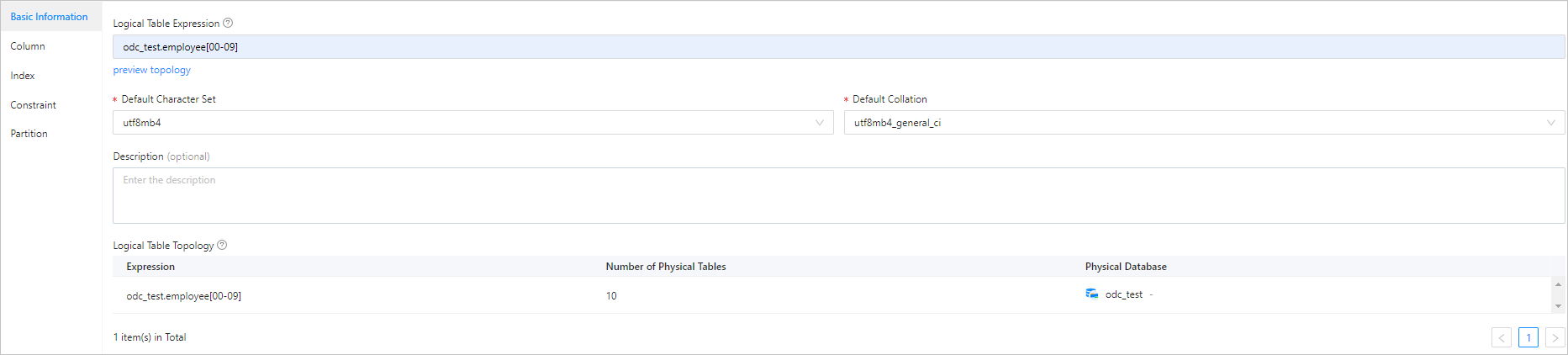odc_test.employee[00-09]expression, for example,odc_testindicates the database name,employeeindicates the table name, and[00-09]indicates to create 10 tables. - The default name of the generated logical table consists of the non-number strings shared by the retrieved physical tables. For example, if the names of the retrieved physical tables are
