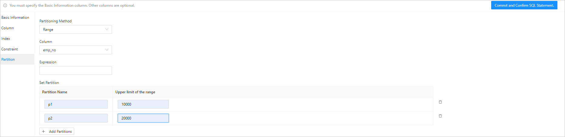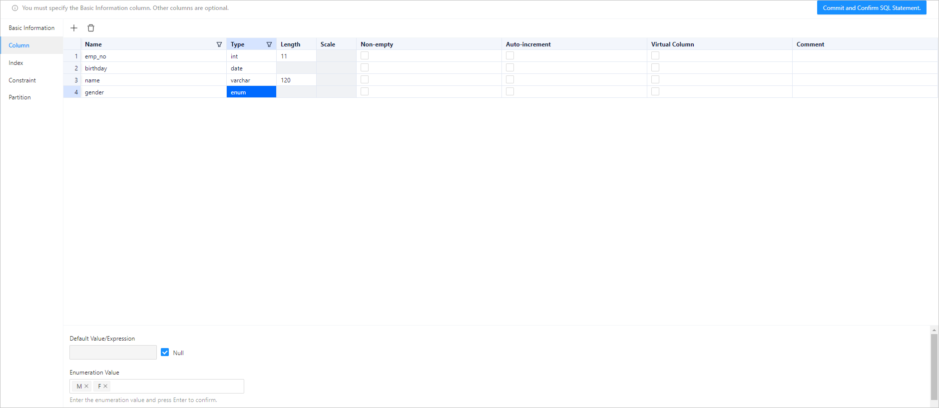 - The basic information and column settings are required. The settings in other configuration steps are optional. After you specify the basic information and column settings, you can submit the settings and confirm the SQL statement to create the table.