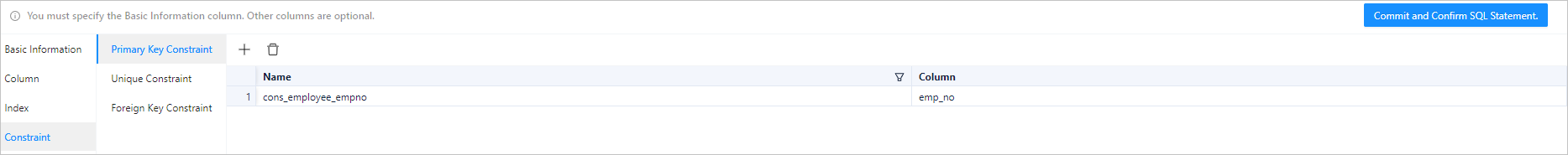 PRIMARY KEY constraint: Defines a primary key to uniquely identify each row of data in the table. A PRIMARY KEY constraint can be a field or a group of fields. You can set only one PRIMARY KEY constraint for a table, and you cannot modify the PRIMARY KEY constraint after you configure the constraint.