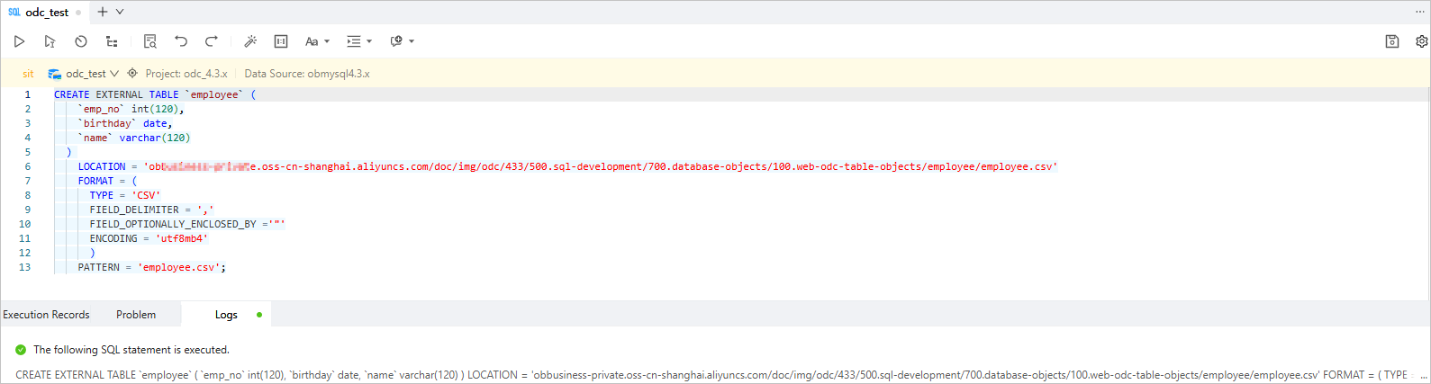 The example in this section describes how to create an external table named employee in the odc_test database managed by ODC in the SQL window by mapping the specified file in Alibaba Cloud Object Storage Service (OSS) to the odc_test database.