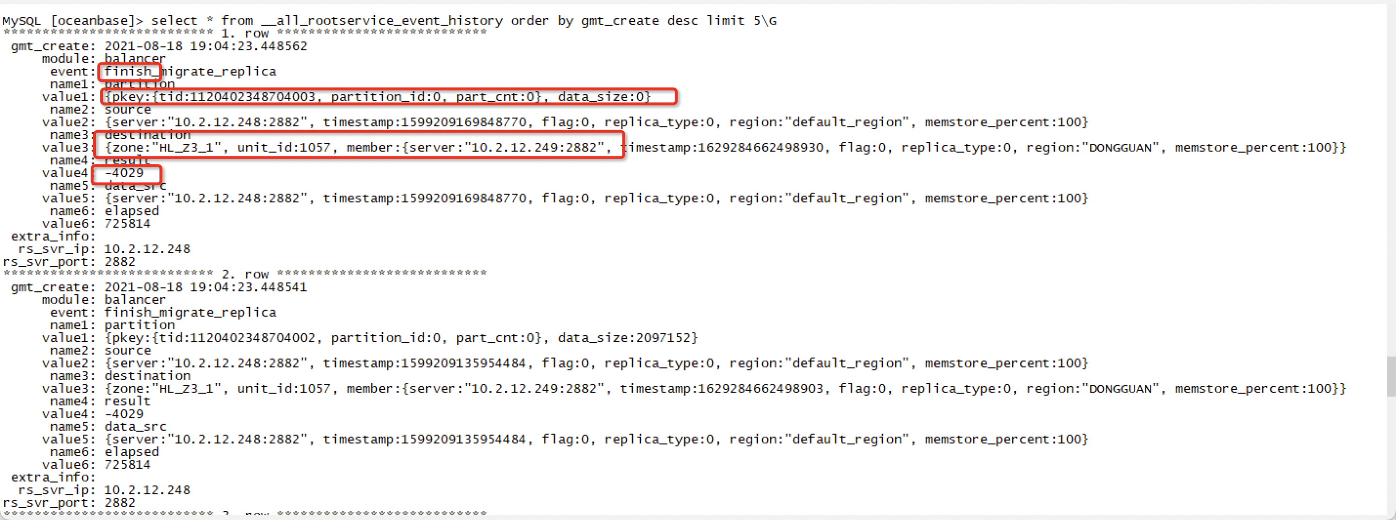 SELECT * FROM __all_rootservice_event_history WHERE value1 like "%table_id%partition_id%" ORDER BY gmt_create desc limit 10;The preceding statement identifies the specific load balancing task so that you can obtain the